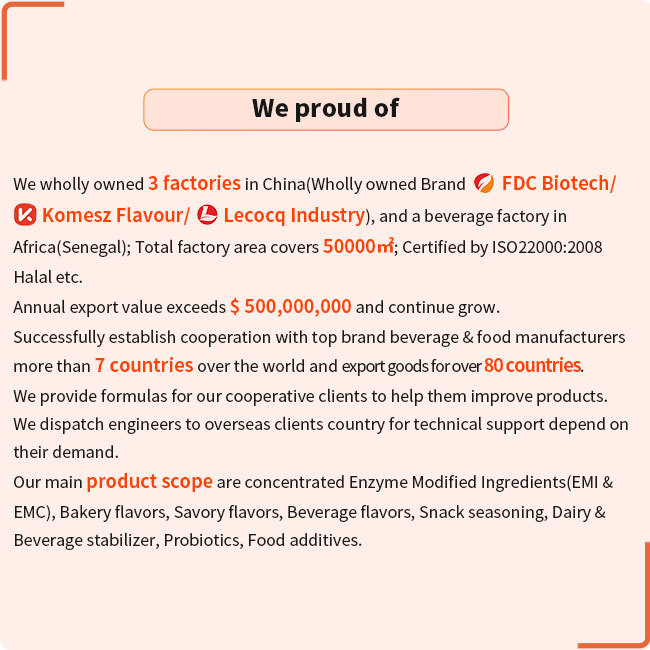 আমরা ৪০০০ এর বেশি ধরণের খাদ্য স্বাদ, দুগ্ধ ও জুসের জন্য স্টেবিলাইজার, প্রোবায়োটিকস, কনসেনট্রেটেড সিরাপ এবং পুষ্টি উন্নতির পণ্য সরবরাহ করি।